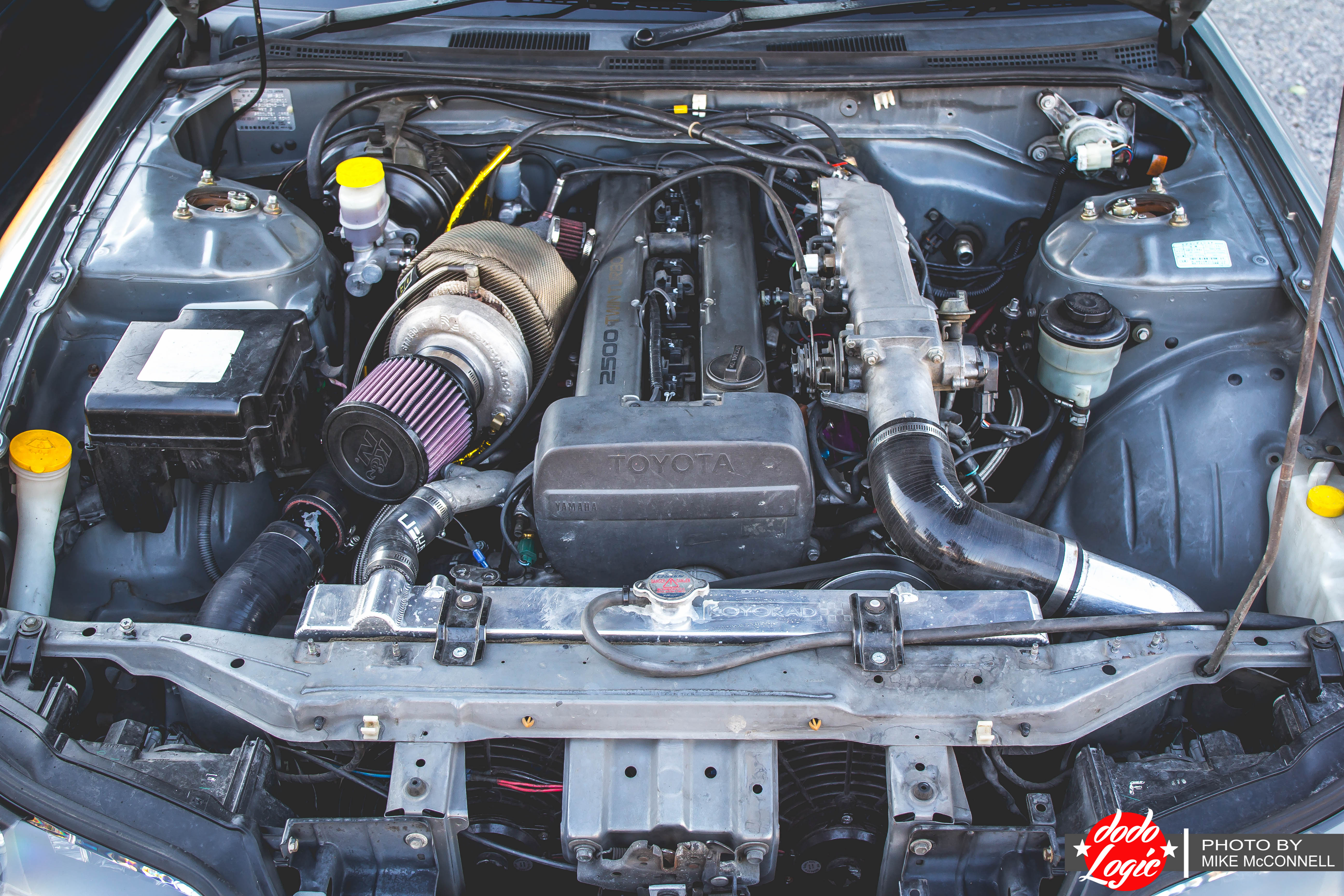 The 1JZ-GTE is equipped with a Borg Warner s200sx Turbo and the factory injectors have been upgraded to 1,000cc injectors. The frustrating business of dealing with the wiring harness was sorted by a Panic-Wire custom engine harness. The engine has a bunch of other obvious goodies like a Greddy frontmount intercooler and a Koyo radiator, just to name a few. All of this is tied together quite nicely by a Apex-i Power FC.